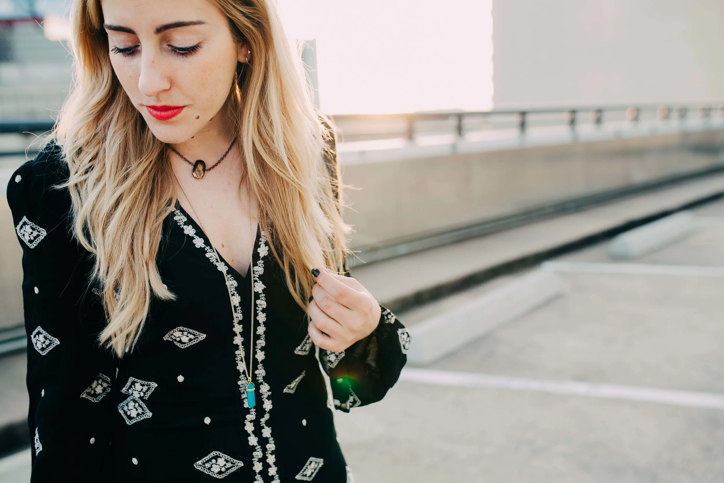 I fell in love with this Lily of the Valley dress the moment I saw it. Perfect for transitioning into spring with a pair of leather sandals or booties for a more urban-moto feel. I paired this dress with a cool long turquoise gem necklace by Elizabeth Volk Design and a bronze choker I picked up from a local street vendor.