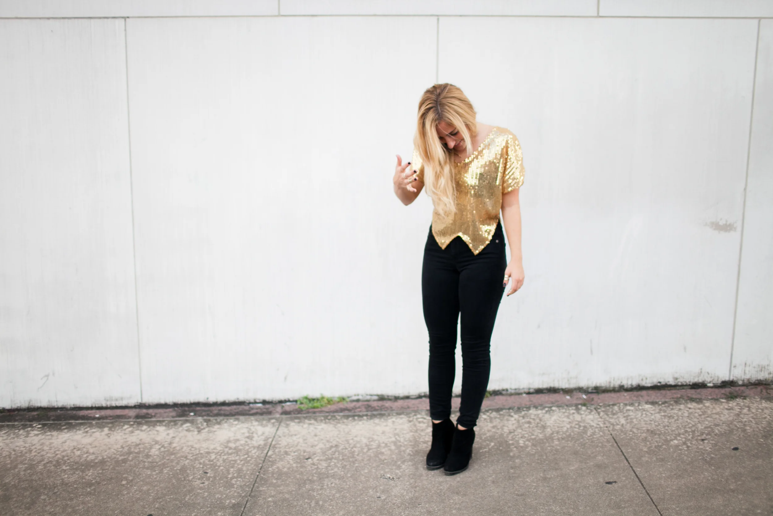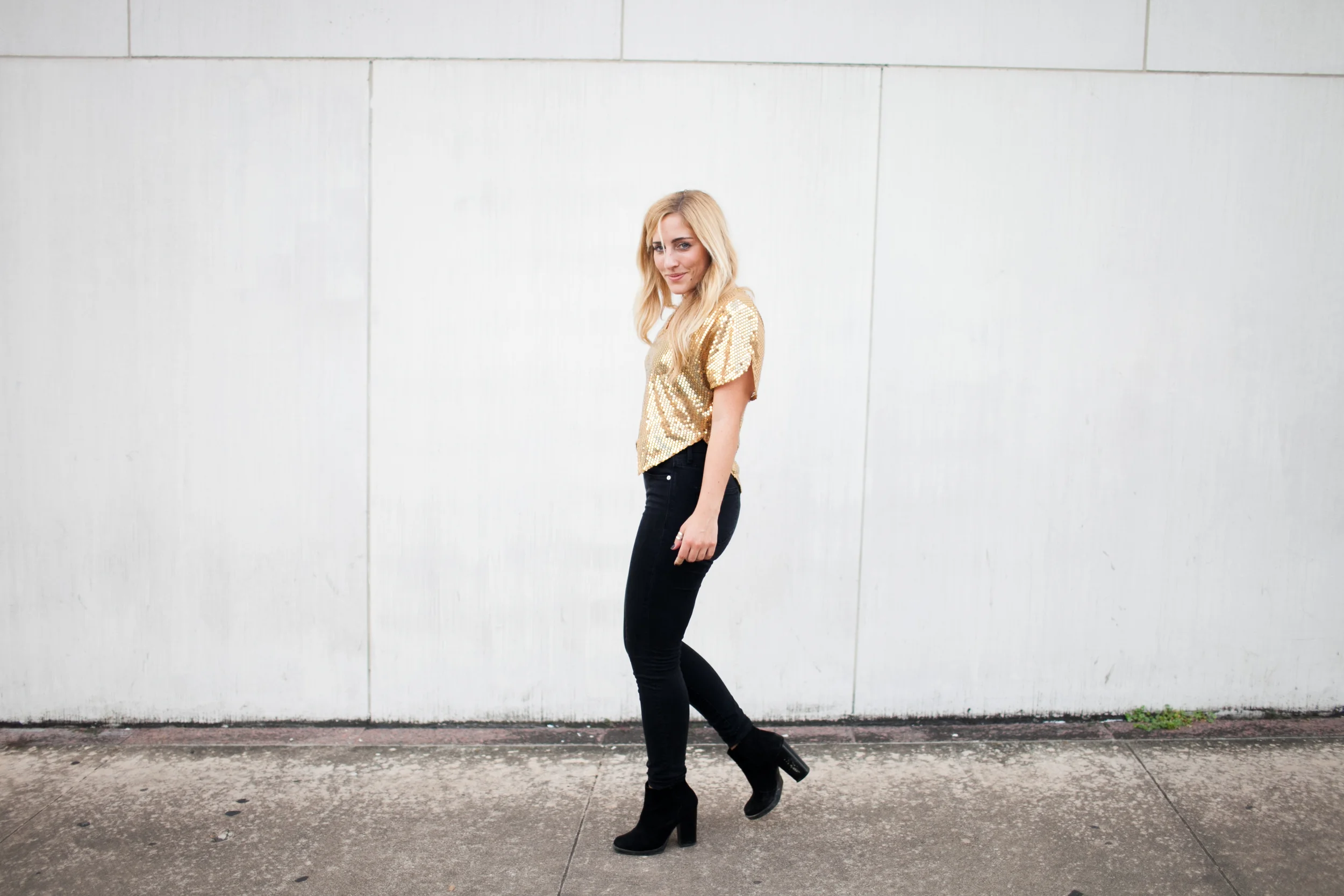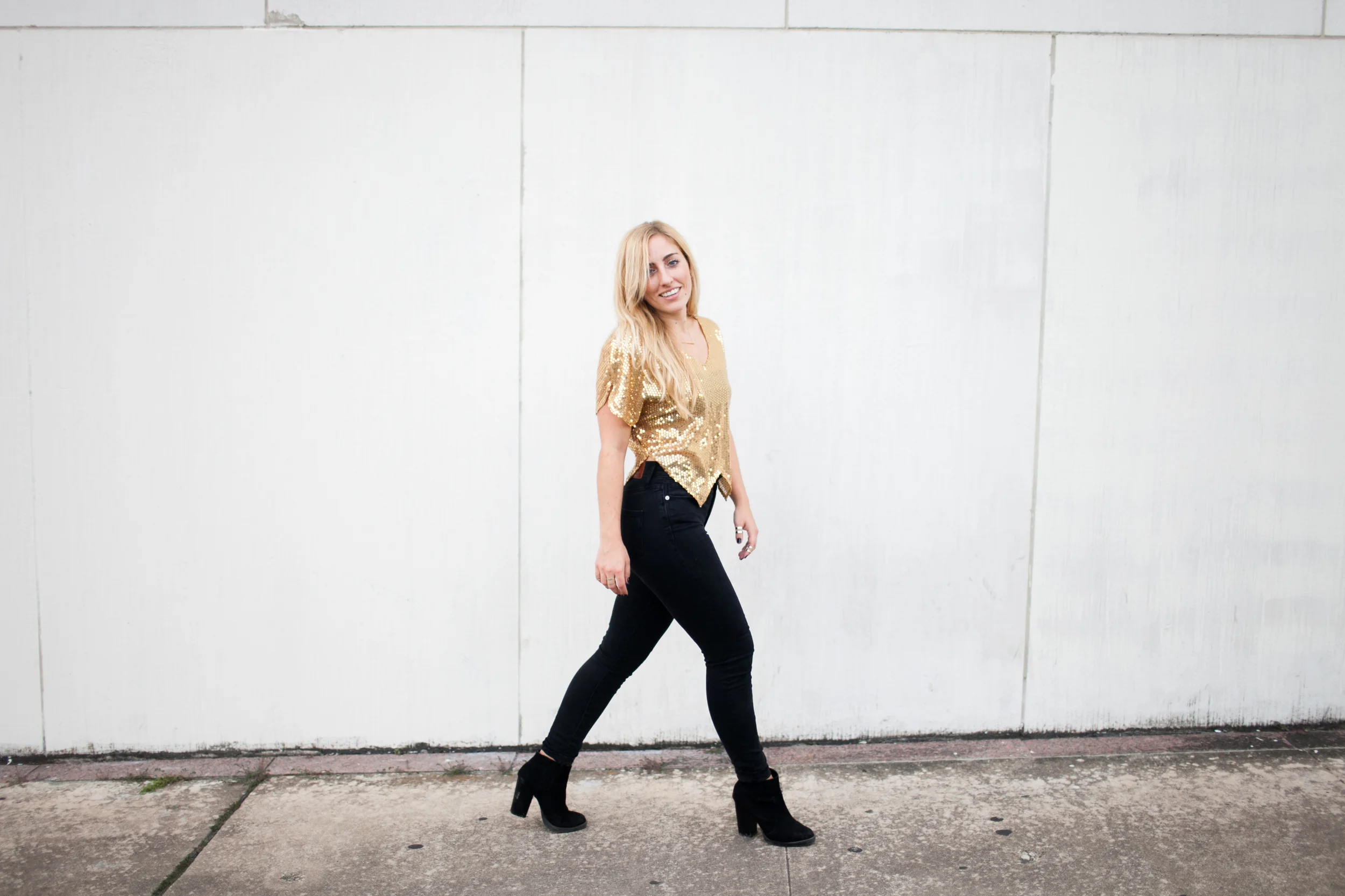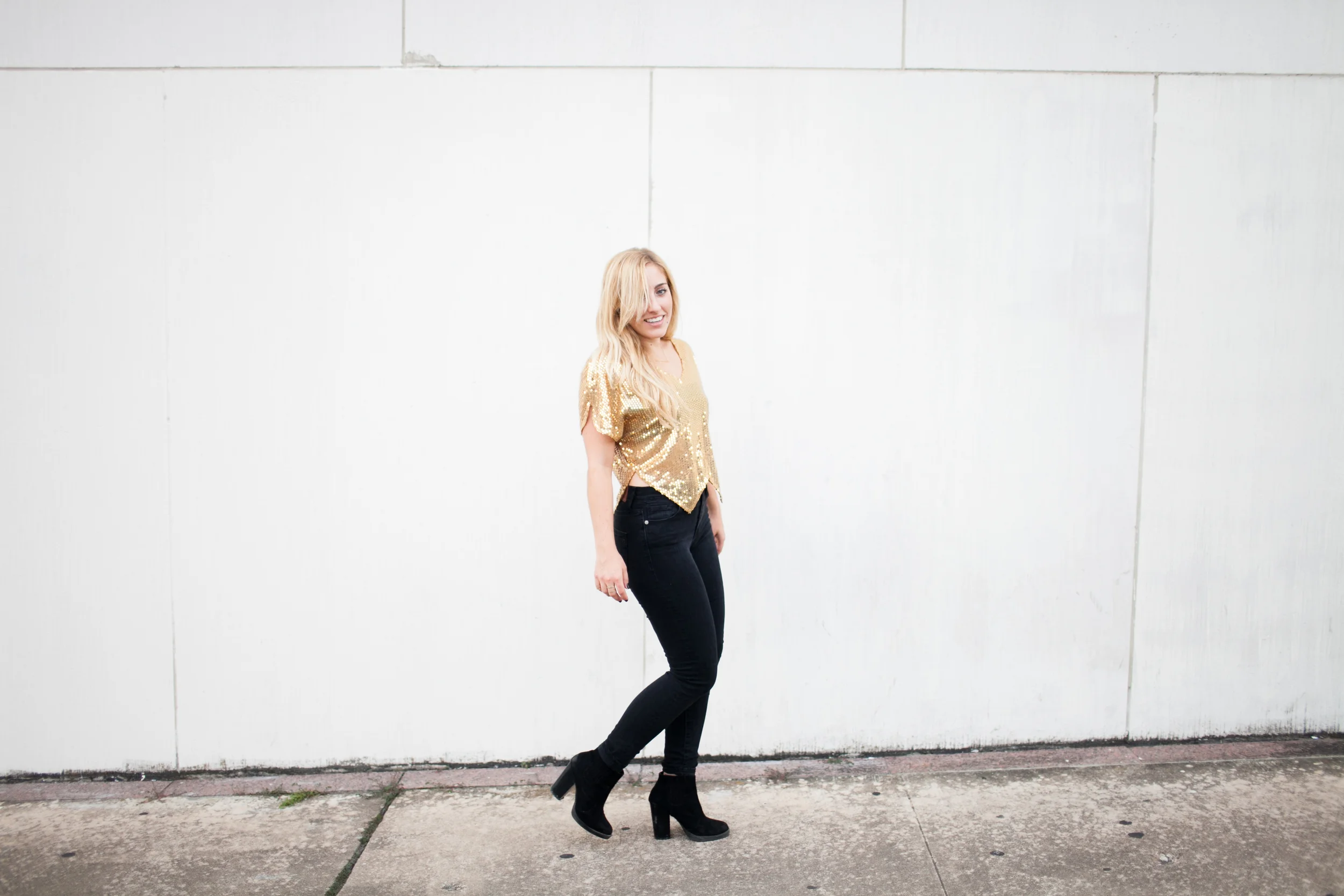 I found this majjjj gold sequin top at Free People (similar) a while back and wanted to wear it to a NYE party but ended up letting it hang in my closet.. twas very sad. It just hung there without use.. sooo then The Gold Atlas came to life & I realized that is what it was waiting for (clothes have feelings right?). So, if you ever buy something and don't wear it.. there's sometimes a reason.. like you might start a blog and think this totally defines a part of you. Madewell is my go to for denim and these black high-risers seem to live on my body. My accessories are from H&M - love me some ring stacking. Booties are Zara. Basically black and gold are the combo to the most amazing combo.. like pb&j or margs & tacos or pita & hummus or road trips & mixed tapes or coffee & topknots or campfires & s'mores..etc. Basically just letting you know I love me some black & gold.